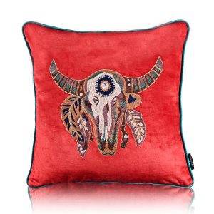 Bison Multi Colour Hand Embroidery Crimson Red Cushion Cover