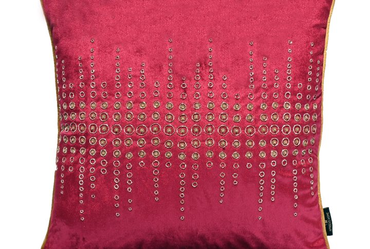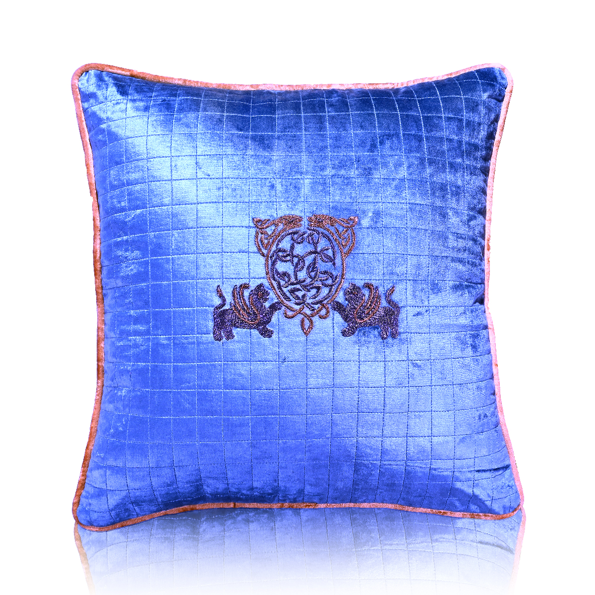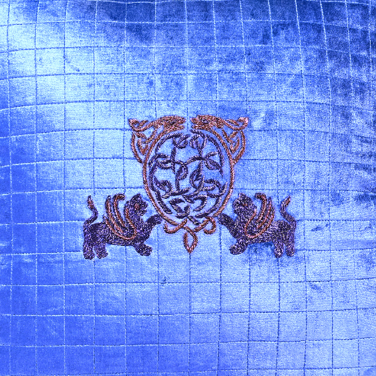 A legendary emblem embroidered in ——- on a checkered blue lustrous velvet base, this Cushion Cover would complement whites and light hues well. colour of emblem?