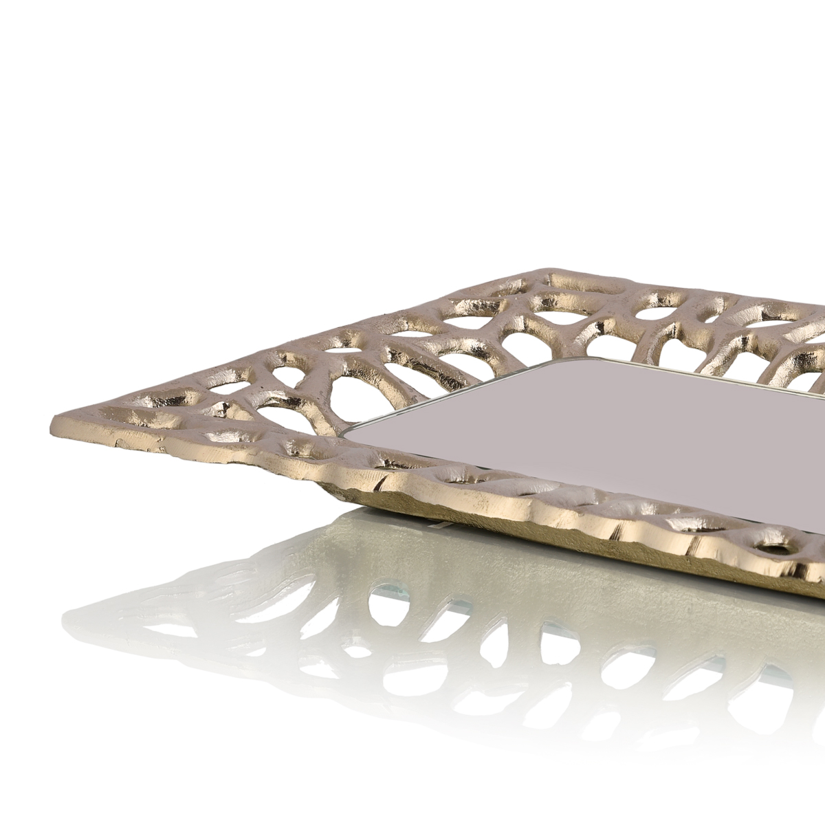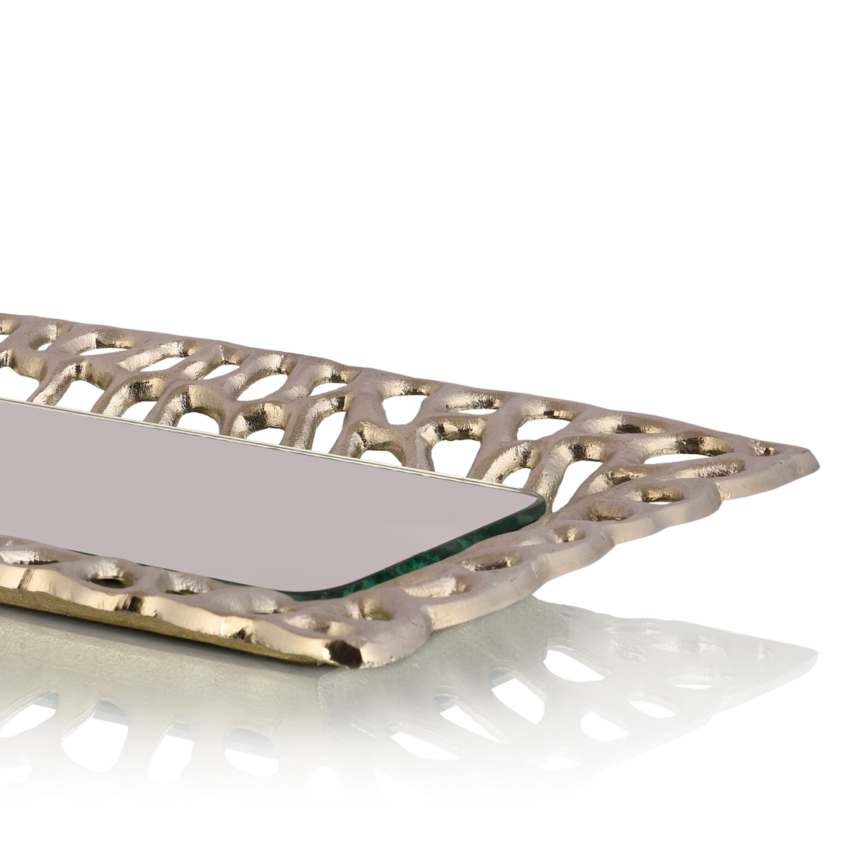 - Expertly handcrafted, this tray brings together the sophistication of mirrored glass and the organic charm of coral-inspired detailing.