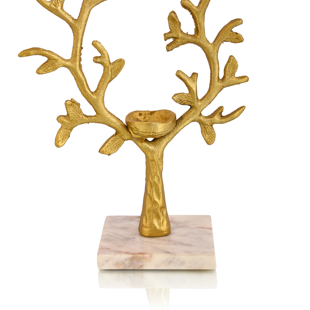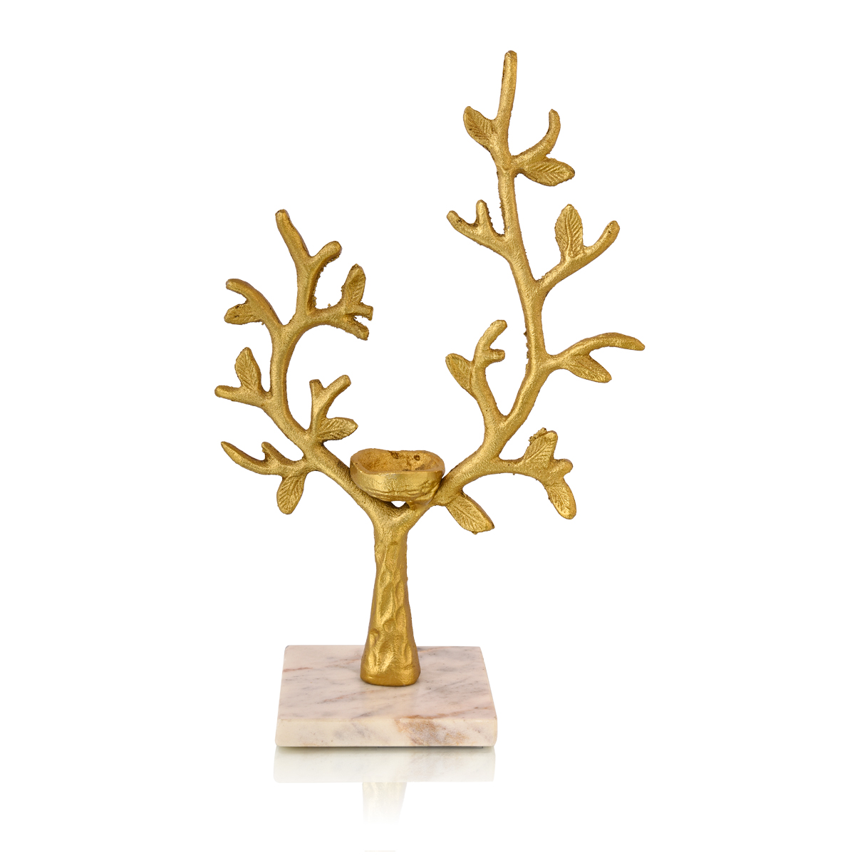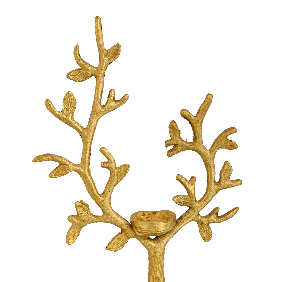 - Crafted in radiant gold, its intricate branches rise gracefully to hold delicate T-light candles, creating a warm and enchanting glow.