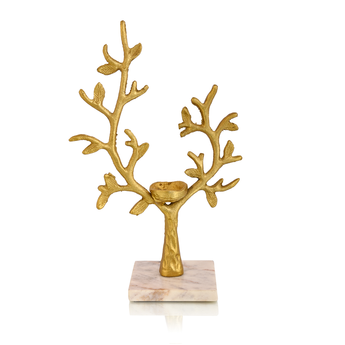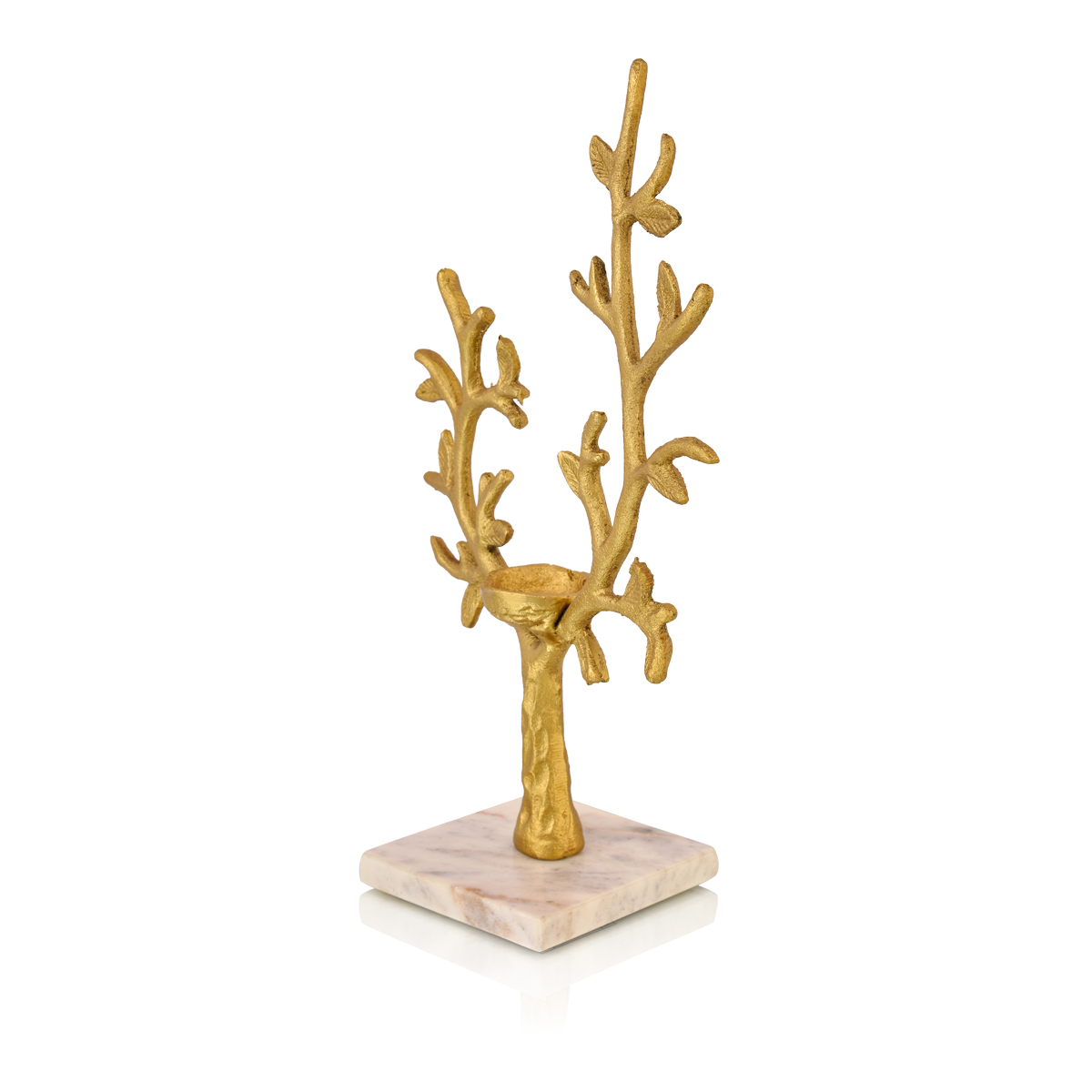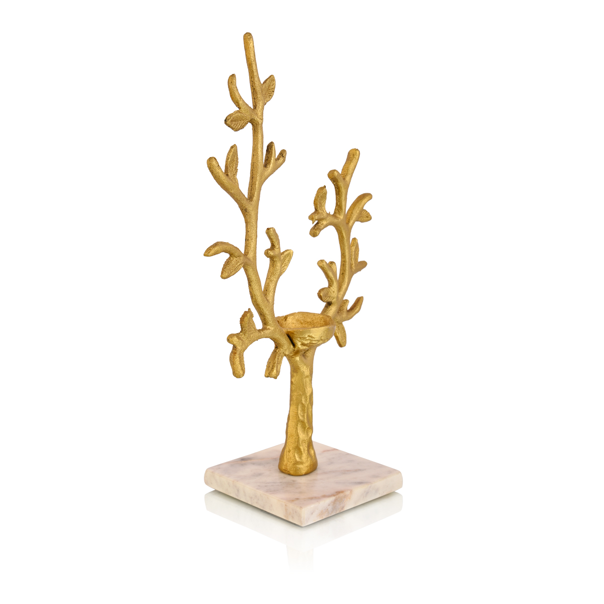 - Crafted in radiant gold, its intricate branches rise gracefully to hold delicate T-light candles, creating a warm and enchanting glow.